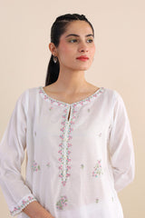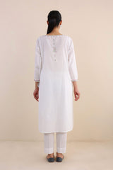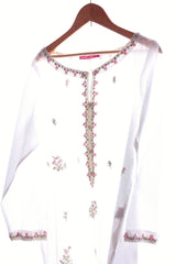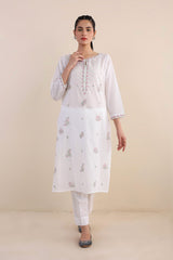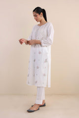An embroidered kurta with boat neck and slit, full sleeves with pockets, paired with an embroidered shalwar.