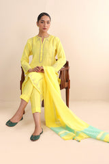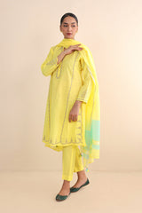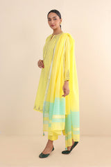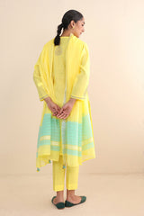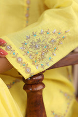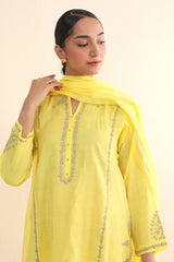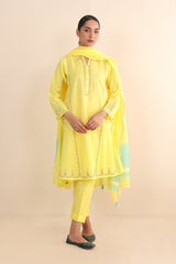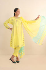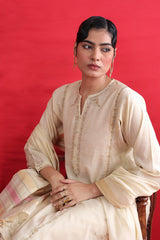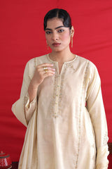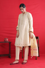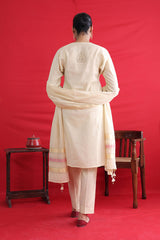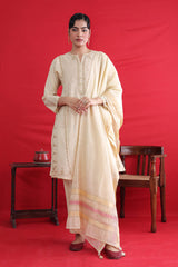 Cotton Chanderi Blend, tilla embroidered kurta paired with straight fit pants and chanderi blend two tone dupatta with tassel detailing on corners.