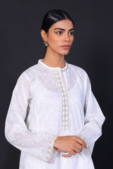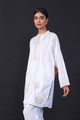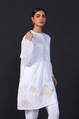 Screen printed panelled kurta with embroidery and golden zari applique details.
