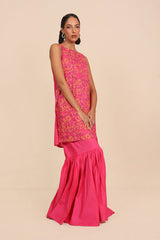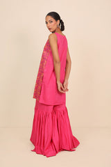 Screen printed sleeveless kurta with mirror work button details on placket and crochet details on sleeve hems. Paired with flared gharara pants.