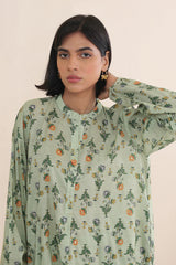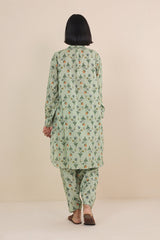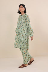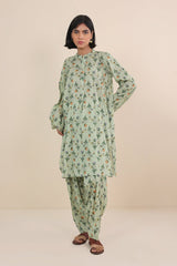 Printed, loose fit breezy kurta with cinched sleeves, paired with classic fit printed shalwar.