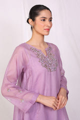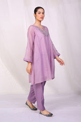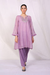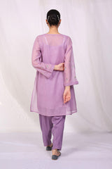 A flared cotton net peplum shirt with pleats on side panels, with duo tone mukaish hand done over the front and sleeves, stitching details on sleeves. Paired with a shalwar.