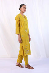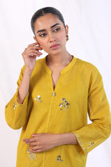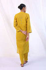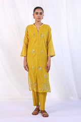 Boxy cotton net Kurta with mukaish embellishments all over. Piared with straight fit pants and cotton silk undershirt.