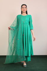 Hand embroidered patti work applique dress with scallops on neckline, paired with staright fit pants and applique organza dupatta with scallop details.