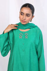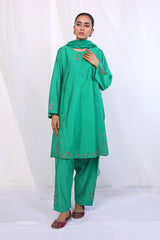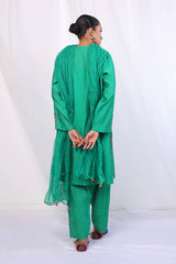 Patti work/applique details on kurta with buttons on neckline, paired with embroidered patti work shalwar and crushed dupatta.