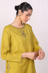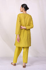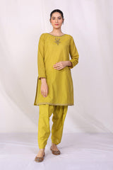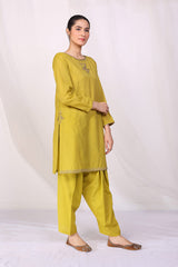 A loose fit, A-line shirt with aari work on pakki on neckline, sleeves and front. With a round neck with V shape dip and paired with a matching embroidered shalwar.