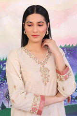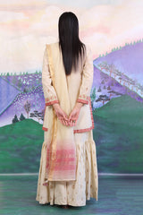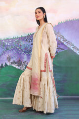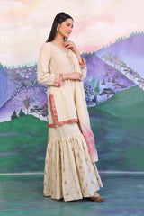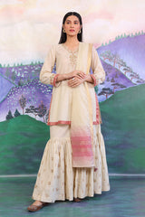 Cotton Karandi kurti with golden aari & thread embroidery details on neckline & sleeves with jacquard finishings. Paired with dual tone jacquard chanderi blend dupatta adorned with gota finishings & flared embroidered gharara pants.