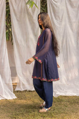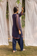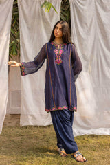 A celebration of heritage and artistry, this ethnic embroidered paneled kurta features a round neckline with a V-slit. Intricate cross-stitch embroidery adorns the neckline and panels, extending to the sleeve borders and shirt’s hemline. Paired with a solid-hued, classic-fit shalwar, it ensures a style that never fades.