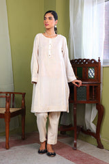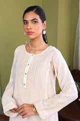 Lurex lined, dori embroidered kurta with lace details on sleeves and button details on plackett, paired with straight fit lurex lined pants.