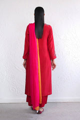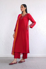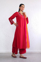 Pk Rawsilk, A-line embroidered shirt with side pockets and V neckline. Paired with loose fit culottes and tonal silk dupatta.