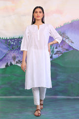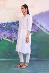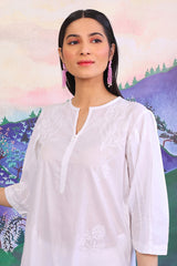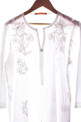 Shadow work hand embroidered kurta with hand made flower on neckline.