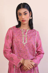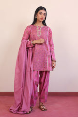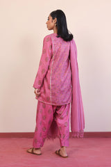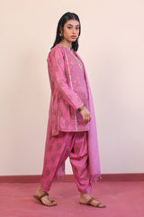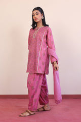 Printed panelled short kurta with gota embelishments, paired with printed classic fit shalwar, adorned with gota and yarn dyed striped dupatta.