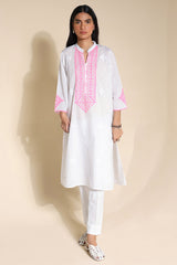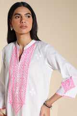 A classic straight-fit handcrafted shirt with a low band neckline and V-slit, adorned with delicate applique work and fine stitching. Can be paired with any Generation bottoms for a chic look.