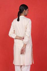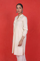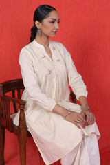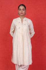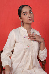 Stitched pleats detailed tunic with cinched sleeves and hand embroidered florets and buttons on neckline.