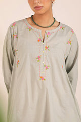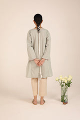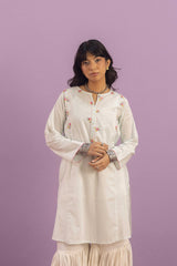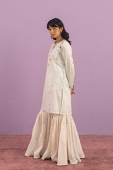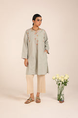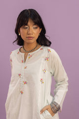 A classic fit, pastel-hued kurta featuring a round neckline with a delicate V-slit. The neckline and bodice are adorned with intricately handcrafted phool booti motifs, adding a touch of finesse. The sleeve hems are accentuated with delicate stitch detailing, making it a versatile piece that can be paired with any Gen fit.