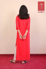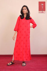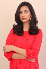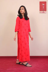 Long full length shirt with mirror highlighted embroidered motifs all over, straight sleeves and round neckline.