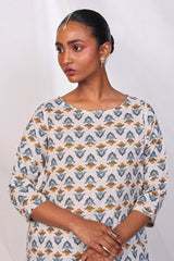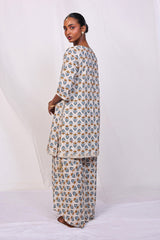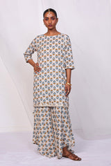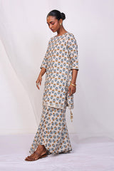 A printed co-ord set, with a boat neck with gota details on sleeves. Paired with flared sharara pants