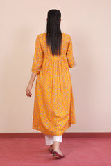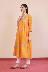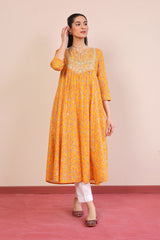 Printed flared dress with gather details on front & back, adorned with sequins embroidery details on neckline.