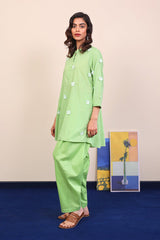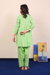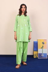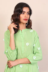 Plain solid kurti with plain laser cut 3-D flowers. Piared with classic fit plain shalwar.