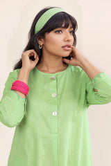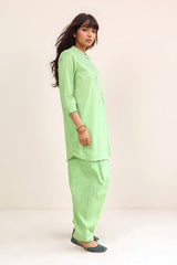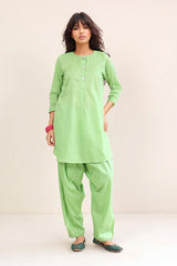 A short solid shirt with large buttons on placket, with cuffed sleeves. Paired with a shalwar.