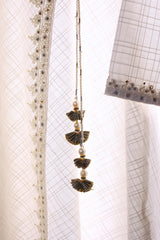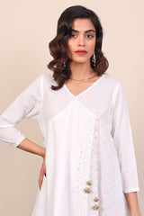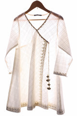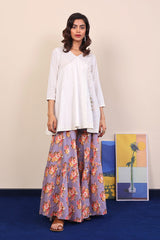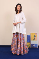 Micro check flared short angrakha with dori embroidery and muskaish details. Adorned with tassel dori. Paired with flared printed pants.