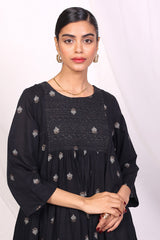 Flared jacquard buti tunic with pannels, stitching details on neckline and gathers.