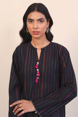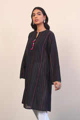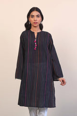 A straight embroidered shirt with a minimal look, with tassel and metallic embellishments on placket.