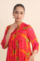 Bold & bright floral printed top with band collar and pleats detailing at the shoulders with gathers at the back.