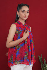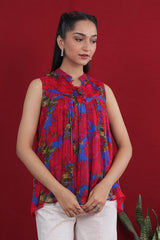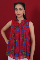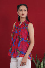 Bold & bright floral printed sleeveless top with band collar and pleats detailing at the shoulders with gathers at the back.