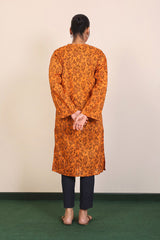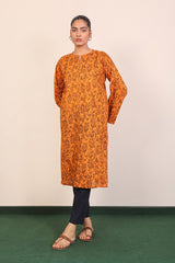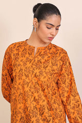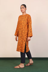 A long printed shirt with band open collars and three quarter sleeves.