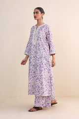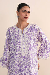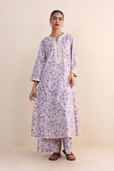 Printed, A-line long kurta with embroidery details on neckline & sleeves. Paired with flared printed culottes.