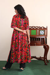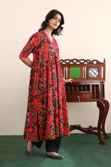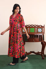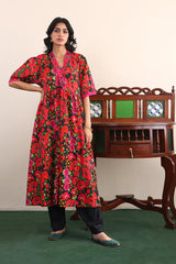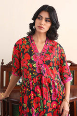 Flared printed dress with gathers and cuff sleeves. Adorned with dori embroidery and mukaish details on neckline.