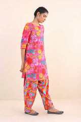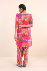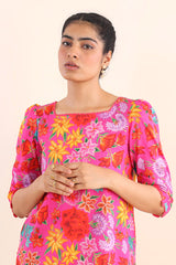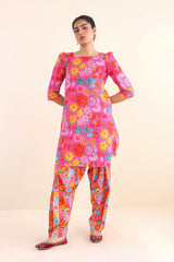 Straight fit puff sleeves printed shirt with crochet details on sleeves & neckline. Paired with contrast printed shalwar.