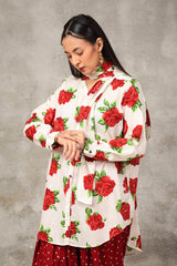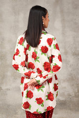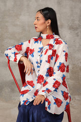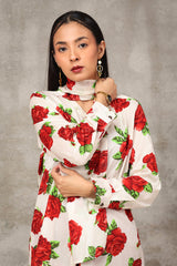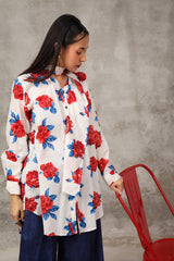 A printed top, featuring a button-down front placket and cuffed sleeves. The design is complemented by an attached printed scarf, adding a graceful touch. Inspired by the breezy charm of blooming roses, the print captures the essence of summer gardens, blending tradition with a modern flair.
