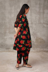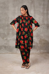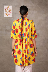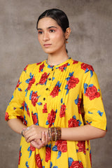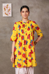 With its refined pleats, the flow and flare of this printed A-line kurta are elevated by a band round neckline and front button placket, adding a dynamic touch to the design. The kurta comes alive in vibrant colors that radiate energy, making it a perfect summer choice for effortless style.