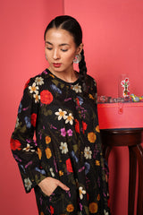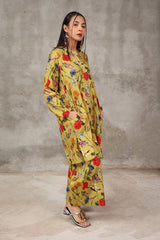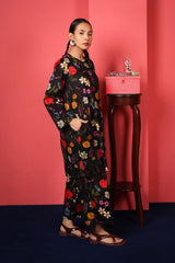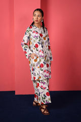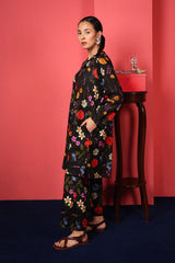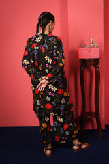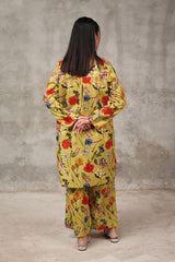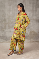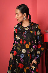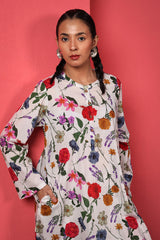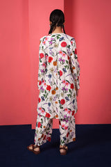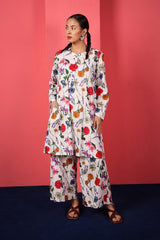 Revel in style with this seamless floral-printed kurta, featuring a round band neckline and buttons on the front placket. Side-friendly pockets add practicality, while the matching printed straight-fit trousers offer an easy, comfortable fit.