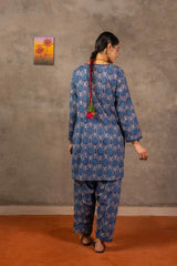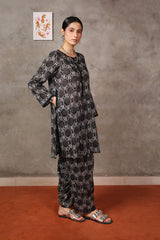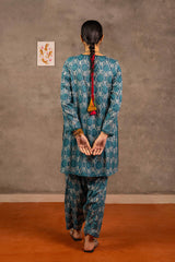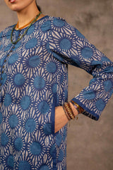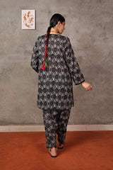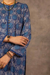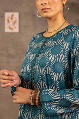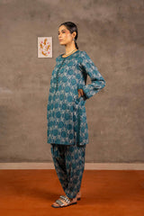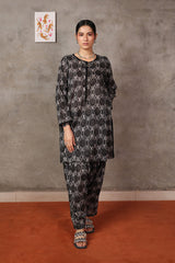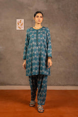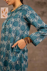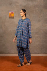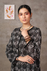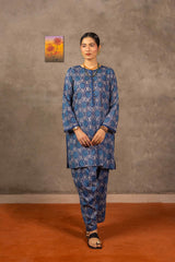 Embodying Nandana’s charm, this breezy printed kurti features a round neckline adorned with classic copper buttons on the front placket. Practical side pockets add functionality. It is paired with matching printed shalwar for a complete look.