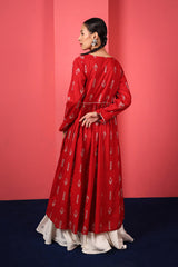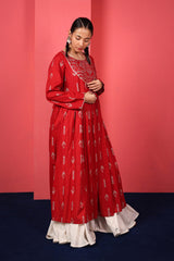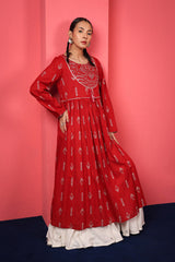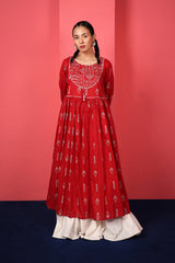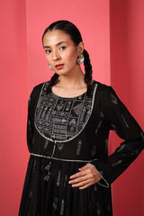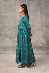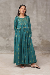 Reviving patterns from ancient Egyptian art, this long, flared frock-style printed kurta features a round neckline and a coordinated printed bodice, finished with subtle trims and tassels, enhancing it posh finish. The lace trim on the sleeve hem and the gathers at the empire waist create a naturally draped, flowy silhouette.