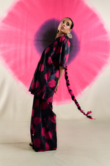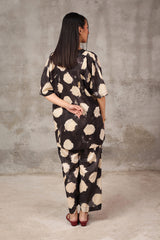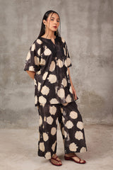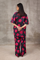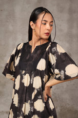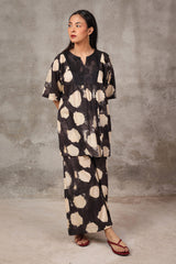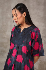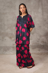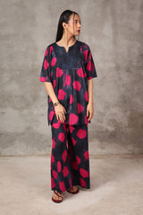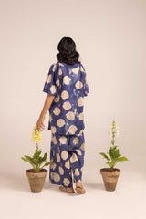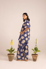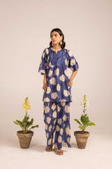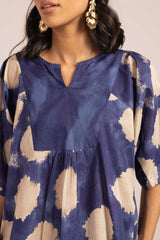 A tinted, printed loose-fit A-line kurti featuring a band round neckline with a V-slit. The midnight-hued bodice is complemented by delicate gathers at the empire waist, adding a flowing, graceful silhouette. Paired with matching printed straight trousers.