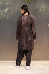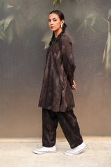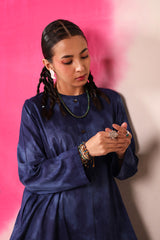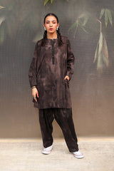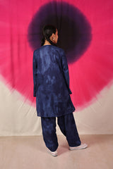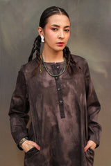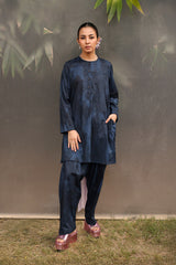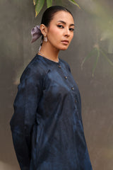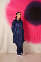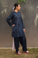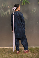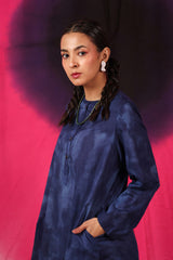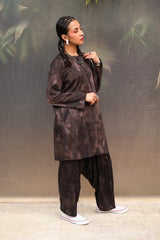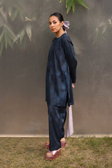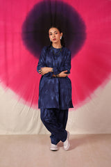 A tie-and-dye easy-fit kurta featuring a band neckline and buttons on the front placket. Side pockets add a touch of functionality. Paired with a matching printed classic-fit shalwar, enhanced with running stitch detail on the ankle hems for a refined finish.