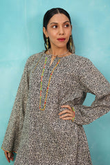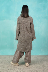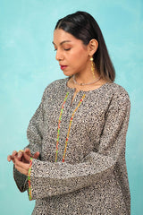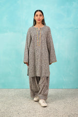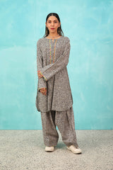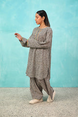 A seamless printed, relaxed-fit kurta featuring a round neckline with a V-slit. The placket and sleeve hems are highlighted with a vibrant, contrast-printed trim, adding a pop of color. Shirt finished with a rounded hem, it is paired with a matching printed, loose-fit shalwar, accented with a striking trim at the ankles for a cohesive touch.
