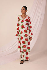 A long, straight-fit kurta adorned with vibrant rose print, featuring a round neckline with a subtle V-cut. The neckline and sleeve hems are delicately embroidered, adding an elegant touch. Paired with matching printed culottes for a contemporary yet effortless look.