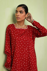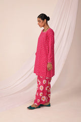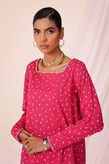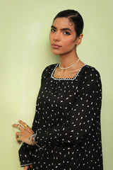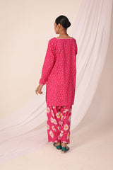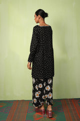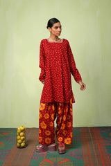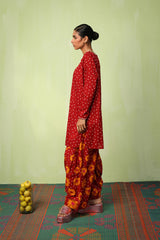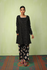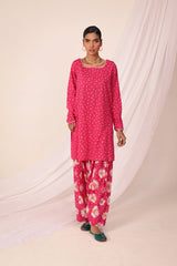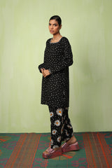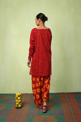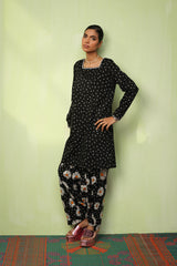 A loose-fit A-line kurta featuring a subtle print and a square neckline for a modern touch. Paired with a contrasting sunflower-printed classic wide-leg shalwar, accented with delicate running stitch detailing along the ankle hemline.
