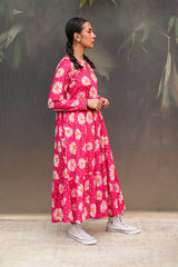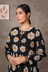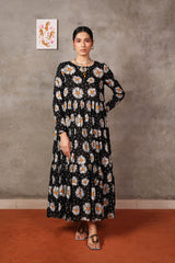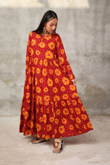 Vibrant-hued sunflower-printed tiered long frock featuring a round neckline with a keyhole opening, delicately embellished with tassels. Gathers around the empire waist create a flattering, flowing silhouette, adding a graceful touch to the design.