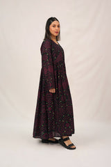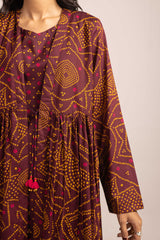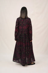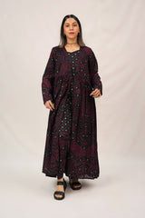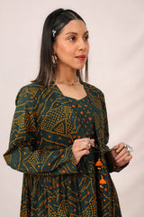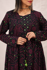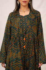 A stunning Bandhni suit featuring a classic loose-fit, long flared kurta with an open front. Gathers around the empire waist create a graceful natural flare, enhanced with tassel detailing. Paired with matching printed straight-fit trousers and accompanied by a printed inner to complete the look.