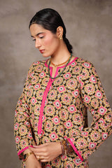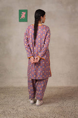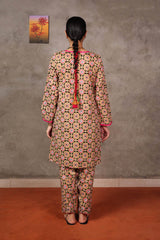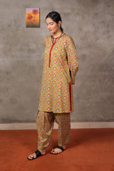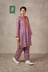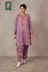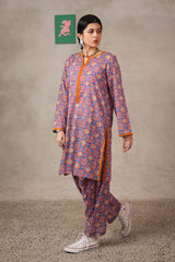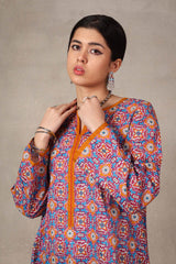This traditional printed kurta showcases a round neckline with a V-slit, complemented by a solid-colored placket adorned with stitching accents. The sleeve hems and side slits are highlighted with striking borders, adding a touch of elegance. Paired with a matching printed shalwar featuring running stitch detailing on the ankle hems, it creates a seamless and refined ensemble.