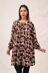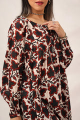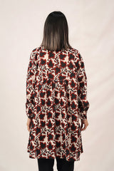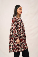 A Jahota floral-printed loose-fit flared top with a round neckline, adorned with buttons on the front slit. The bodice is enhanced with round stitching details, and the sleeves are cinched for a stylish finish. Can be paired with any generation bottom for a versatile look.