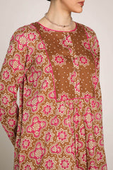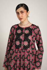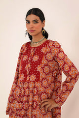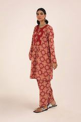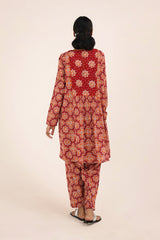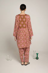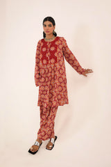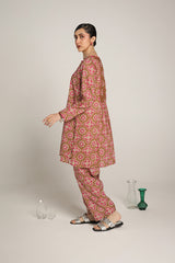 A printed A-line kurta, featuring a round neckline adored with piping trim. The front placket is adorned with buttons, while piping details on the bodice and sleeve hems create a refined contrast. Gentle gathers at the empire waist lend a graceful flare, enhancing the silhouette with effortless movement. Paired with a matching printed classic-fit shalwar for a cohesive, artful look.