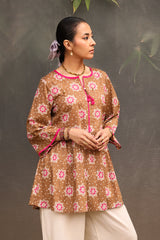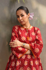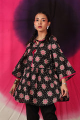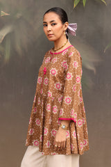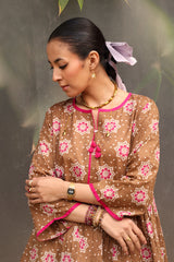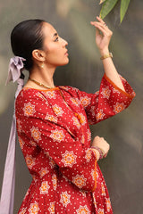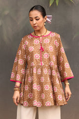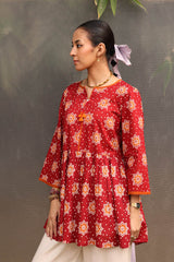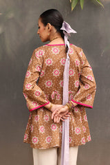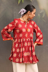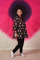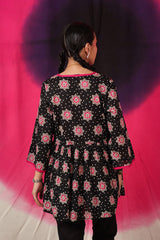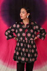 A vibrant Dabu-printed peplum kurta features a round neckline with a V-slit, adorned with buttons and tassels finished with a color-block trim. The sleeve hems are also finished with a matching color-block trim. The gathered waist creates a natural drape, adding to the silhouette’s flow.