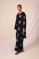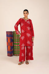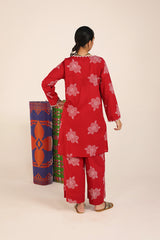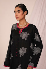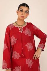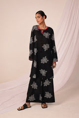 A refined printed classic-fit kurta featuring a round neckline with a V-slit, adorned with tassel detailing. The neckline and sleeve hems are highlighted with vibrant embroidered accents for a striking contrast. Paired with matching printed culottes, creating a seamless blend of comfort and grace.